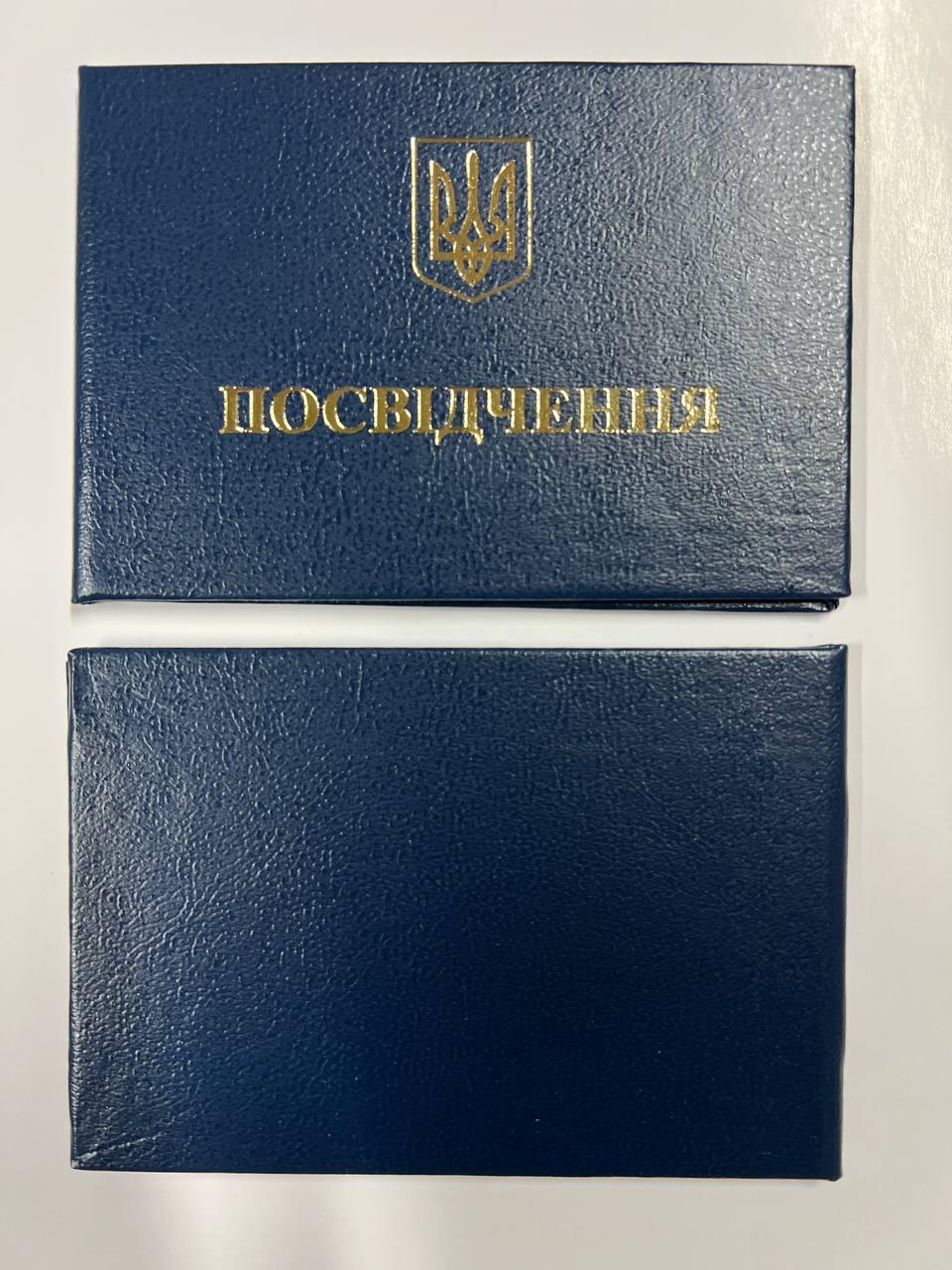 Посвідчення виготовлене з палітурного картону 1,5мм, обтягнуте бумвенілом синього кольору. На титульній стороні тіснення золотими літерами "Посвідчення" та гербом України. Без внутрішнього вклеювання